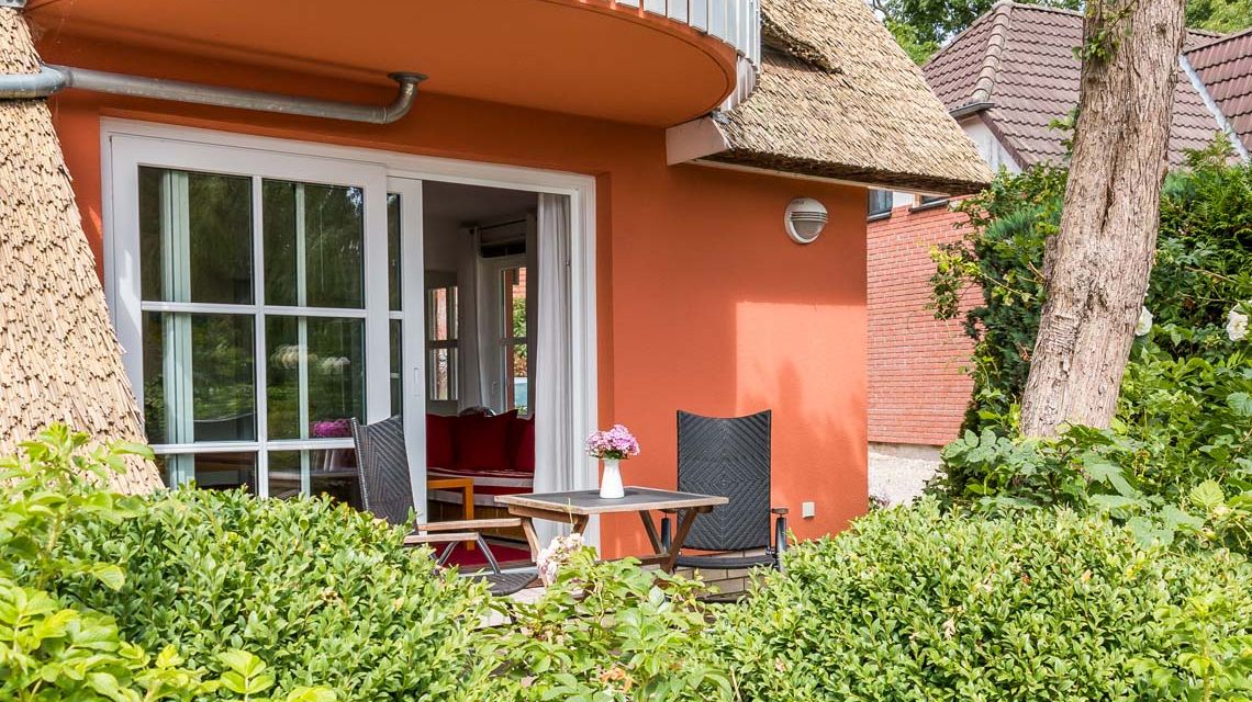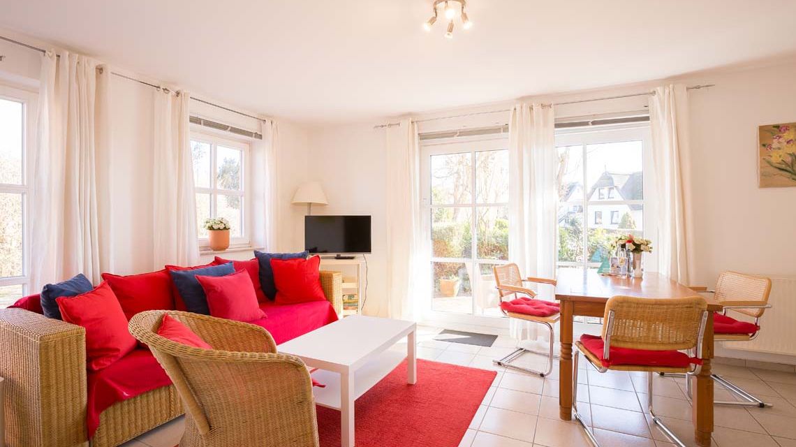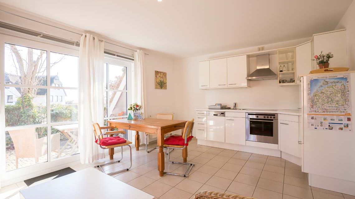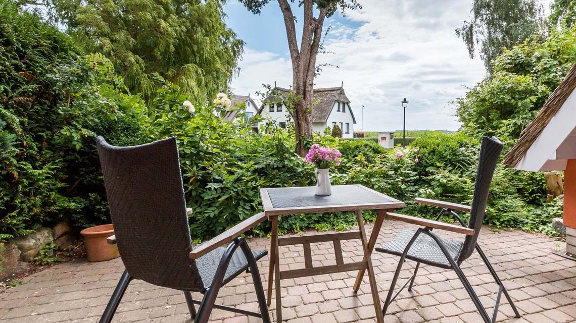 Die großen Terrassen- und Giebelfenster bringen viel Licht in die Wohnung und erhellen diese auf natürliche Weise. Die Terrasse selbst ist zum Bodden ausgerichtet und lädt zum Verweilen ein. Genießen Sie hier das Frühstück in der Morgensonne oder lauschen Sie dem Plätschern des nahen Boddens in den Abendstunden.
