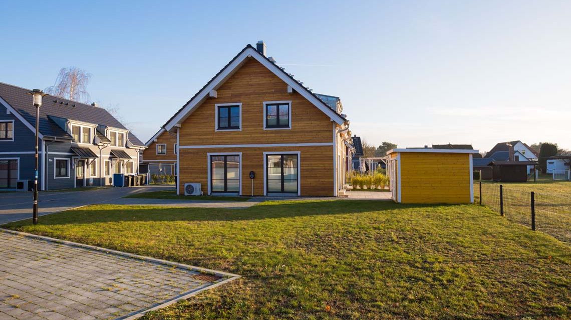 Das offen gestaltete Grundstück ist pflegeleicht angelegt und kann nach den eigenen Wünschen beliebig gestaltet werden. Ein passender Holzschuppen bietet Abstellfläche und Schutz für die großzügige Westterrasse.