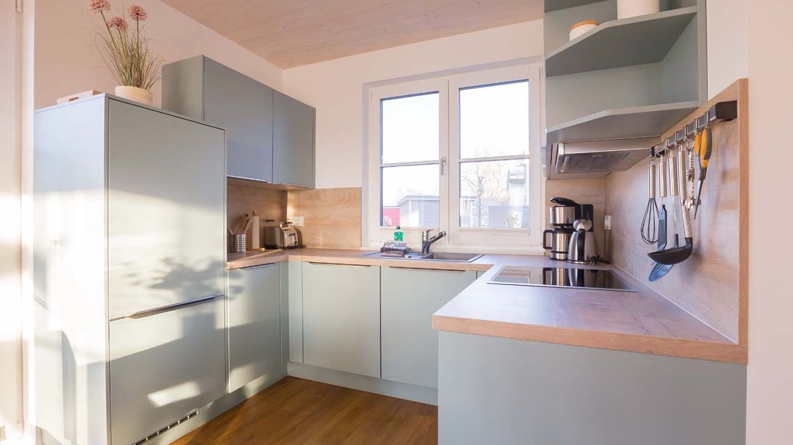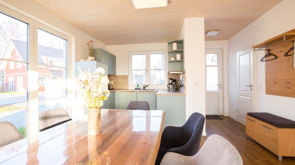 Die 2023 fertiggestellte Doppelhaushälfte begrüßt Sie von Außen mit skandinavischem Charme und im Inneren mit viel Helligkeit. Die bodentiefen Fenster im kombinierten Wohn- und Essbereich lassen viel Licht in den großzügigen Raum. Die hochwertigen Holzmöbel mit klaren Linien und die gemütliche Couch sorgen für das hyggelige Wohlfühlambiente. Ein Kaminofen kann nachgerüstet werden und sorgt dann für noch mehr Gemütlichkeit. Die zeitlose geradlinige Einbauküche bietet viel Platz und schließt sich nahtlos an den Essbereich an. Ein Duschbad mit Tageslicht und ein geräumiger Hauswirtschaftsraum beschließen diese Ebene.