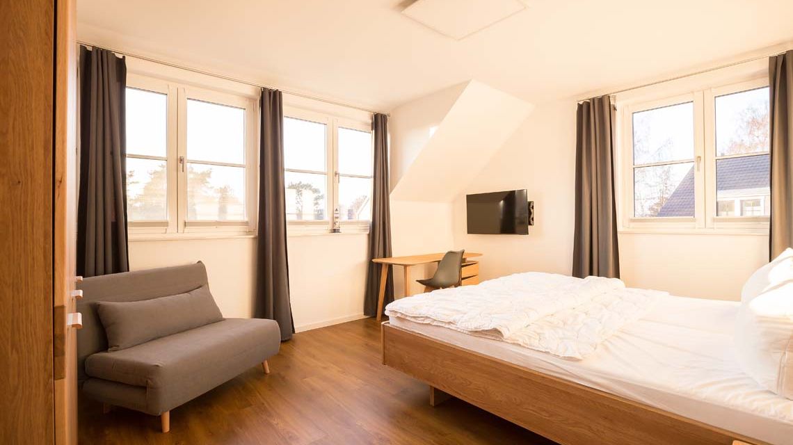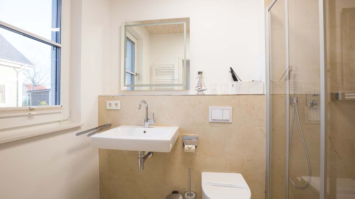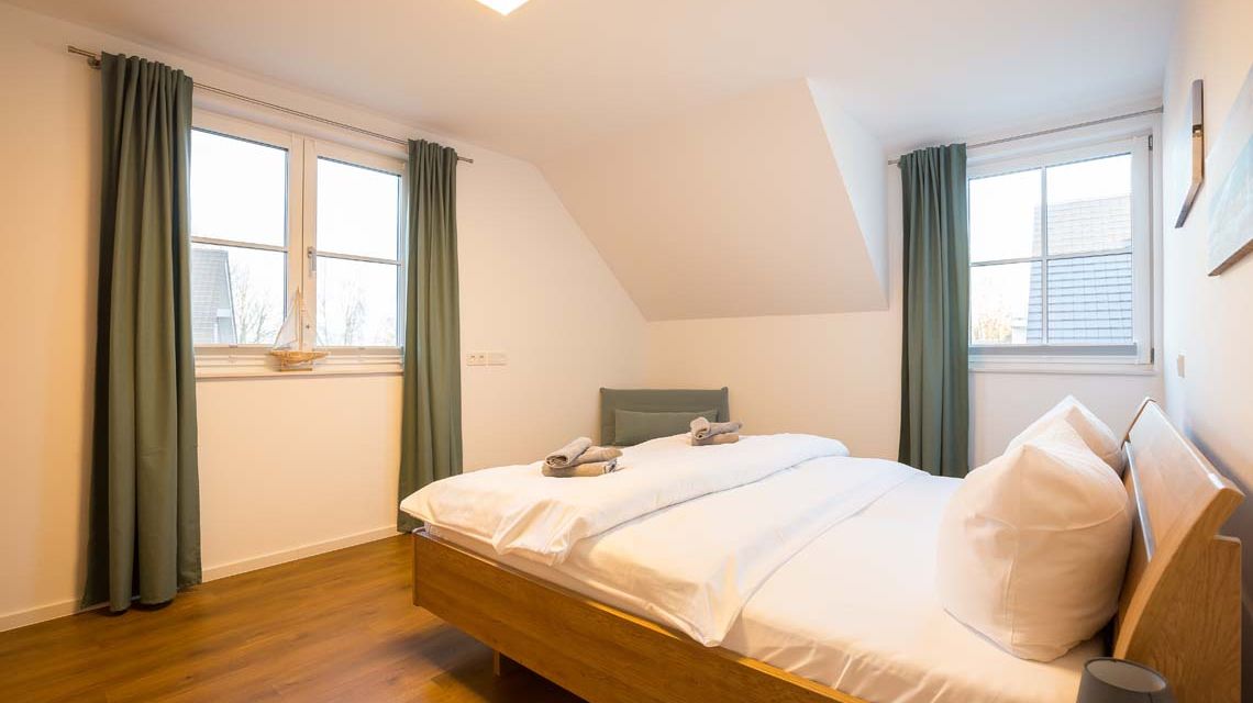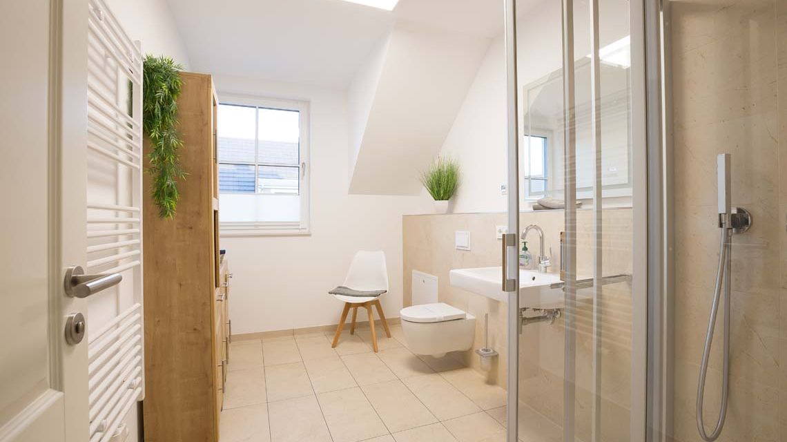 Im Obergeschoss erwarten Sie 2 großzügige und helle Schlafzimmer, jedes mit kleinem Boddenblick, und ein weiteres Tageslichtbad mit Dusche.